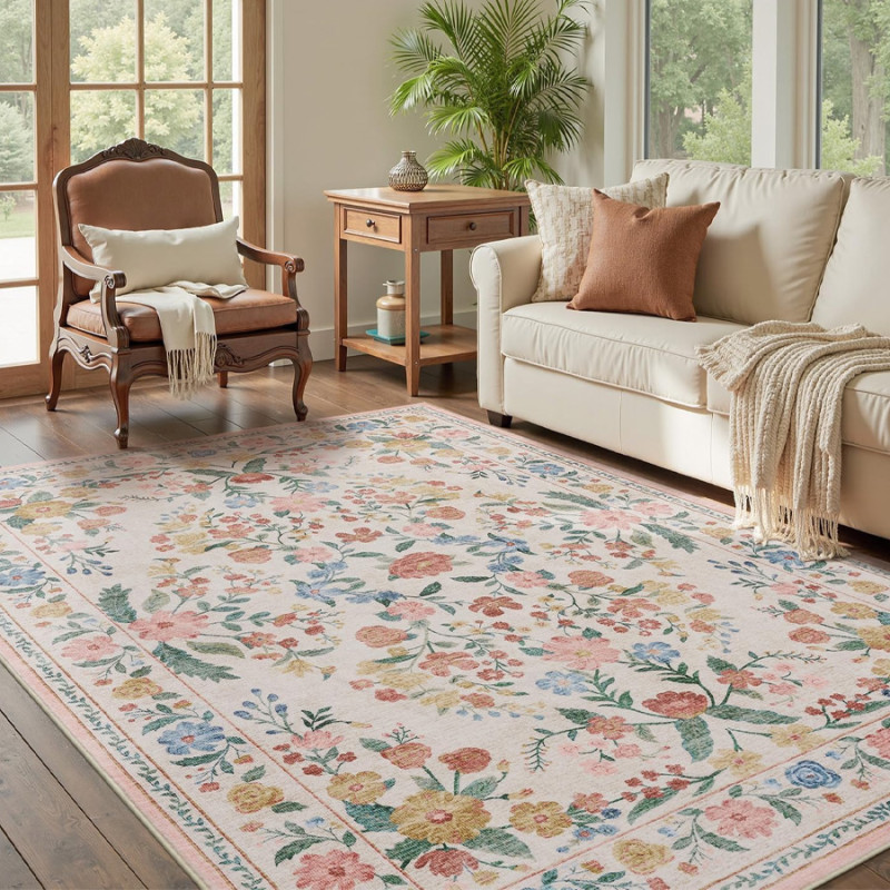 The showstopping design of this area rug is what really makes it stand out. Featuring a romantic, garden-inspired print, this beige rug has colorful flowers with pops of blue, pink, yellow, and green. Crafted from an incredibly soft microfiber material, this area rug provides a fluffy surface for your bare feet. This comfortable material doesn't just deliver on softness — it's also durable for high-traffic areas and machine-washable. For spills and pet accidents, there's no need to hire a professional carpet cleaner, as the area rug can be safely refreshed in the washing machine.