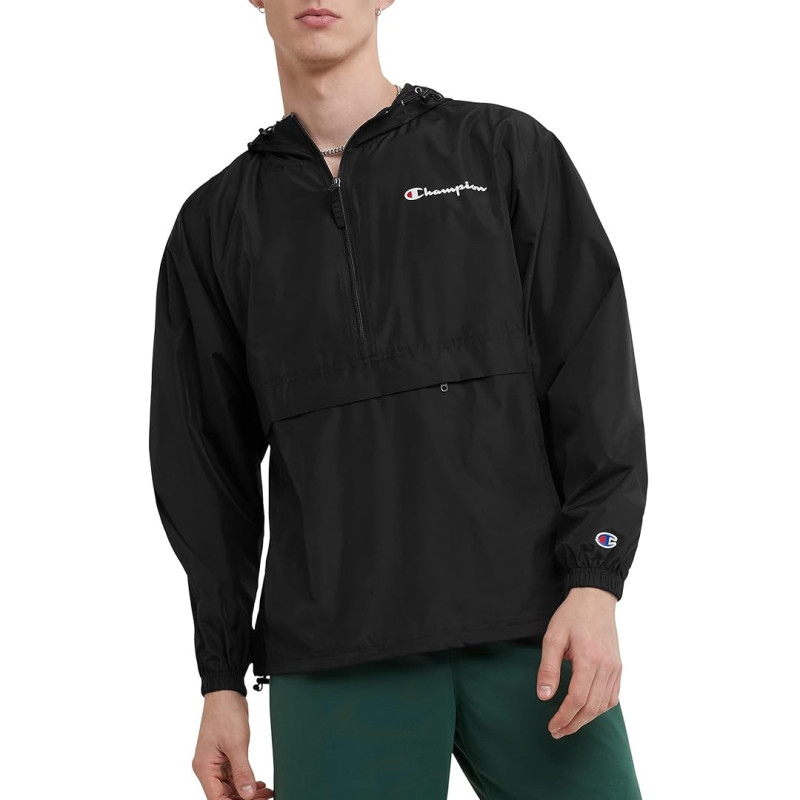 The jacket is designed with a half-zip that ends right around the sternum area, which you can adjust to make the jacket warmer or cooler. It has a bungee cord scuba-style hood which, in addition to acting as another protective layer, can be tightened around the face thanks to the drawstring to provide even better weather protection and a more customized fit. There's a zippered front pocket that sits around the stomach area of the jacket, perfect for holding small items, and a Champion logo patch is emblazoned along one of the shoulder areas, with another Champion "C" logo patch around one of the elastic cuff areas.