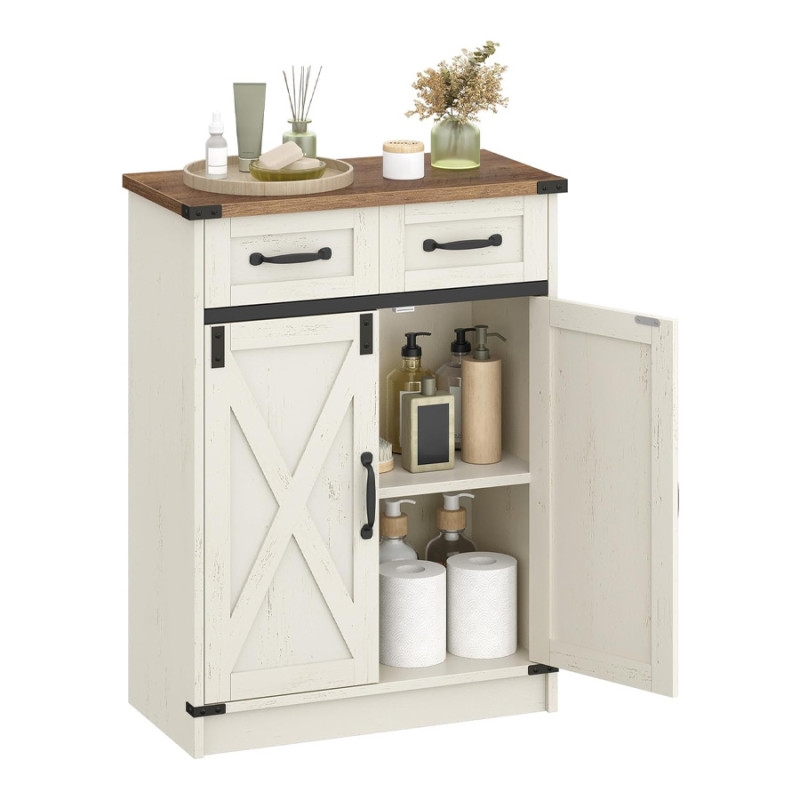 It's hard to imagine a piece of furniture more useful than this one. Made from durable and attractive engineered wood, the cabinet has a substantial look and feel. It's nicely adorned with rustic farmhouse accents that give it a warm and cozy vibe. These include crosshatch patterns on the cabinet doors, dark metal handles and brackets, and a woodgrain countertop that's reminiscent of a French country style kitchen counter. In addition to the bottom cabinet, the pantry includes two medium-sized drawers at the top.