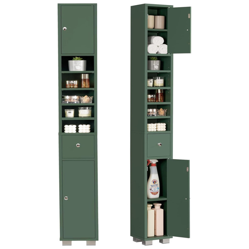 This storage cabinet features five adjustable shelves, allowing you to make room for larger or smaller items. It also has four more shelves located in the top and the bottom cupboards. The drawer in the middle is ideal for items like cosmetics, Band-Aids, and other smaller items that may roll around or fall easily off the shelves. The whole unit is eight inches deep, eight inches wide, and 71 inches tall, fitting items such as tall paper towels, shampoo bottles, lotion bottles, cleaning spray, rolled up towels, and more. It's perfect for all the little odds and ends that get left on top of the counter or get lost in bigger bathroom cabinets.