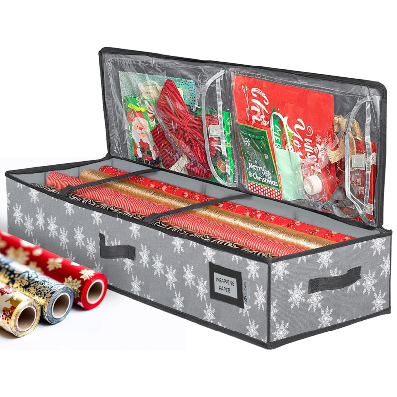 - Holds: The container holds up to 27 rolls of wrapping paper, and has additional room for gift bags, bows, ribbons, tags, and more wrapping accessories.