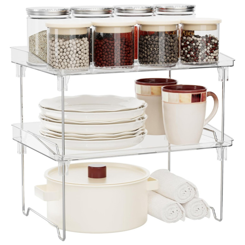 The set comes with two shelves, each measuring 11.8 inches long, 8.4 inches wide, and 5.9 inches high. Crafted from PET, they have a sleek, clear shelf top with raised edges that keep their contents contained. The legs are made of stainless steel and are foldable, so you can break them down easily, fold them, and put them away when they're not in use. These kitchen organizers are stackable, giving you the opportunity to take advantage of vertical storage space when you can.