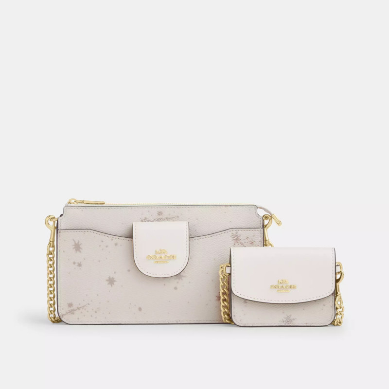 Now, to the bonus accessory. The detachable card case is made of crossgrain leather. It has a multifunction pocket, a snap closure, and an outside pocket. You can easily fit a pair of earbuds in there and some cash or credit cards. It also serves as a great spot for lip balm or keys. The card holder has a 3-inch chain that you can attach directly to the bag. You can also attach the card case to the crossbody bag's main chain strap.