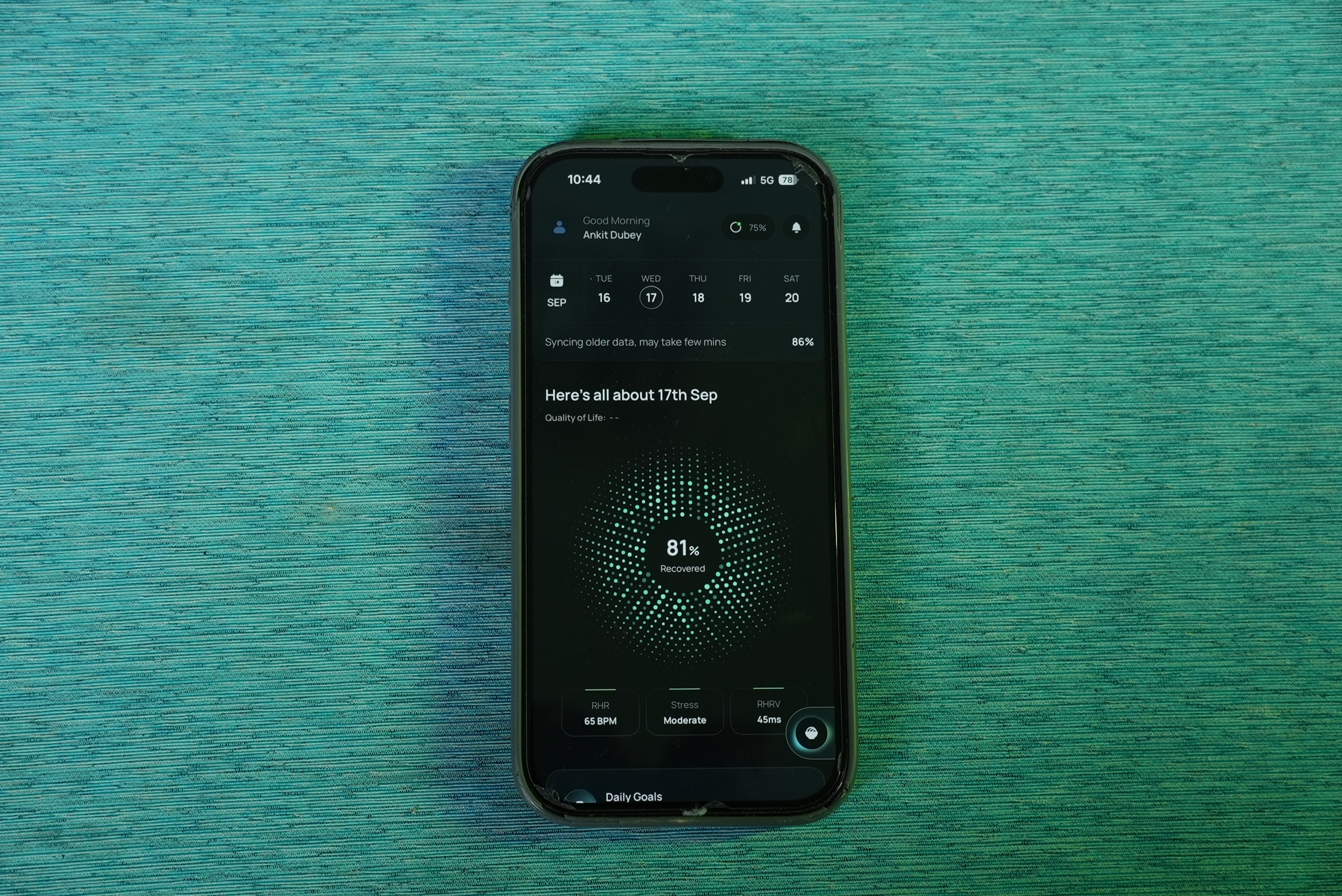 Despite its size, the Hart X2 is packed with sensors. It tracks your sleep, heart rate, oxygen levels, calories burnt, activity, VO2 Max, stress, and even skin temperature. The experience feels very different from smartwatches because there’s no screen – it quietly gathers data in the background while you go about your day.