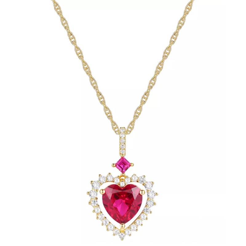 This necklace is made with two lab-grown rubies with a total weight of 5/8 of a carat and a lab-grown white sapphire with a total weight of 1/3 of a carat. The design is a heart-shaped ruby with a heart-shaped pavé set of stones around the edges. There's another ruby above the heart and more sapphires trailing to the top of the pendant. The chain is sterling silver plated in 14k gold, and it's 18 inches long.