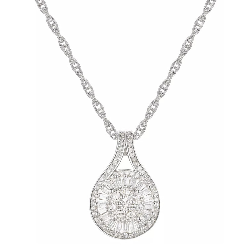 Diamonds always make a statement, but this pendant necklace takes it to a whole new level. The sterling silver chain, which measures approximately 18 inches long, has a dangling pendant that features a cluster of diamonds in the center. The necklace has round and baguette diamonds arranged in a round, circular pattern, with an additional border of diamonds around it, which comes together and meets at the top of the charm. All together, the weight of the diamonds equals ½ carat, and they have a color rating of I-J, indicating they are nearly colorless. Although the diamonds are on the smaller side, clustered together, the necklace still catches the eye and adds a strong sparkle to any outfit it's paired with.