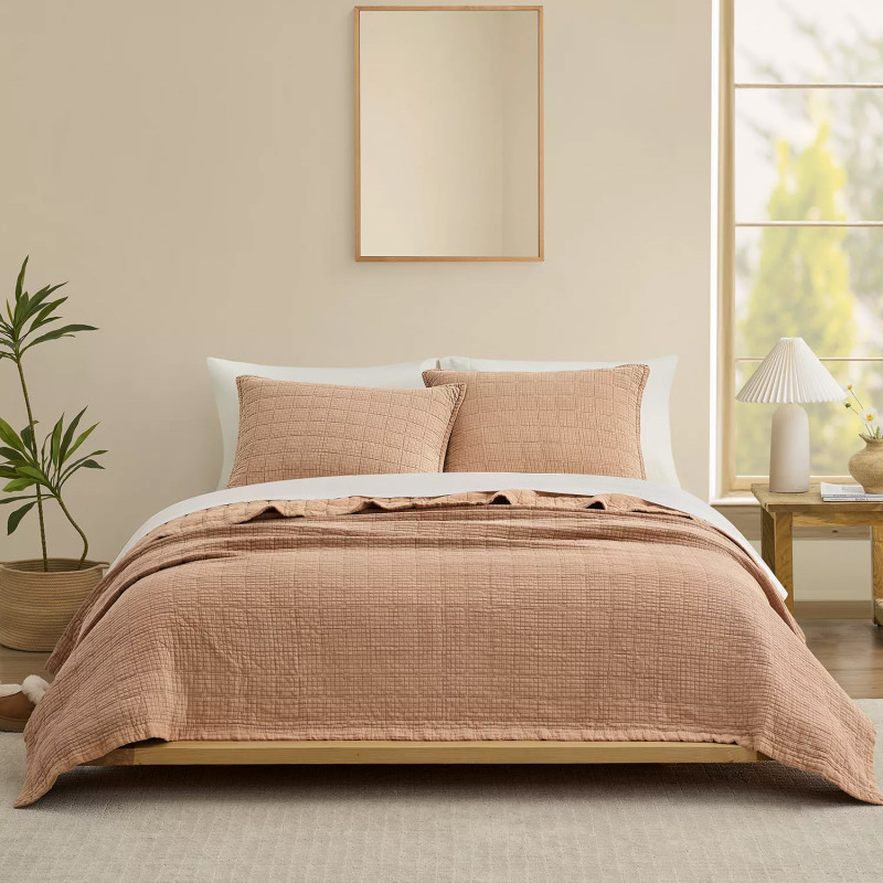 One color of the queen-size comforter has already sold out, but the twin-size quilt set is still available in Sandalwood, a khaki color, and Himalayan Salt, a pale pink.