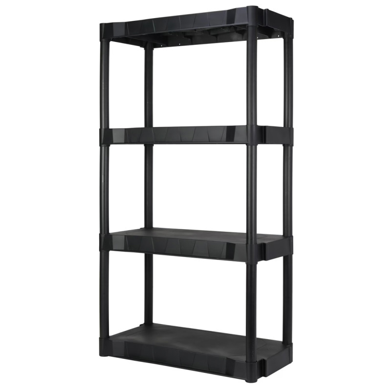 This four-tier shelf can be used on its own or matched with multiple units to create a larger shelving area. It's easy to clean, making it ideal for tools, firewood, or other less clean items, and, because it's made of polypropylene plastic, it can also hold up to rain better than other materials. It's super easy to assemble and requires no tools. Just interlock the joints, and it's ready to go.