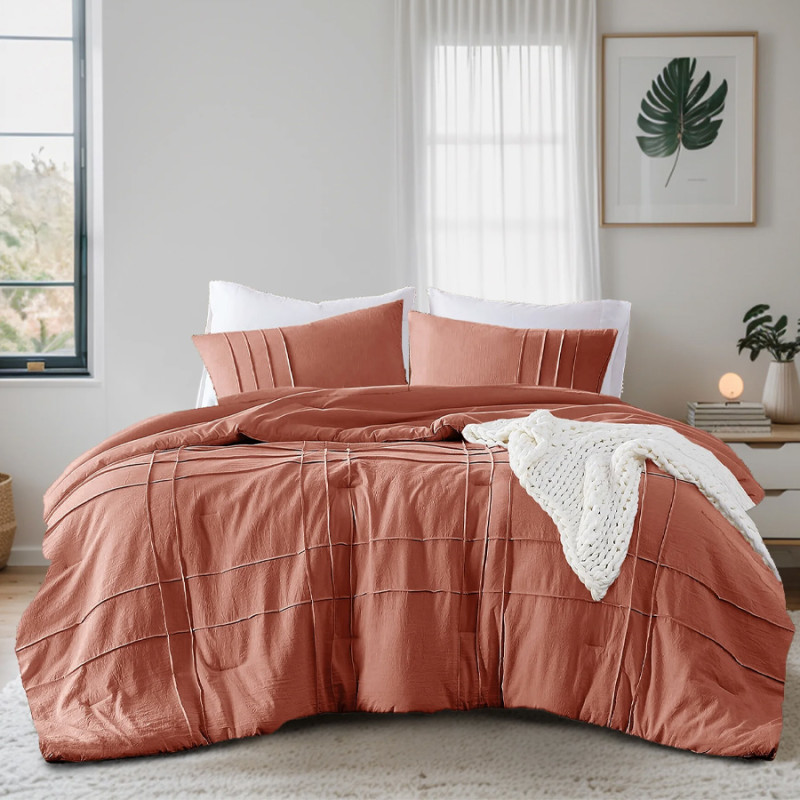 We haven't seen many comforter sets with such a great balance of beauty and utility. The boho pintuck stitching on this bedcover gives it a rustic, almost lived-in, feel that shoppers have been clamoring for lately. The set includes a lightweight comforter and two matching pillow shams. With dimensions of 90 inches long by 90 inches wide, the queen-sized comforter fits perfectly, and drapes nicely alongside even thick-height mattresses. The shams measure 26 inches long by 20 inches wide, making them the perfect fit for standard sized pillows, and even larger ones.