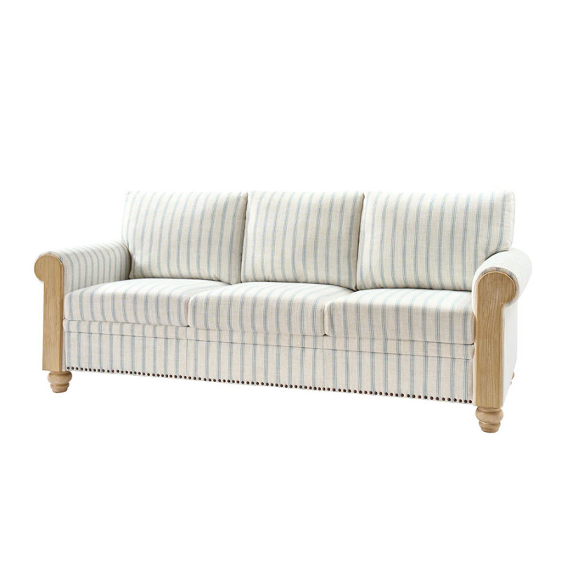 The farmhouse sofa is upholstered in durable linen fabric. It's available in three colors: beige with light blue stripes, beige with gray stripes, and Charcoal gray. The first two combinations have a lighter farmhouse feel, while the gray colorway has a farmhouse flair, but is neutral enough to blend in with different styles. The copper nailhead trim that lines the base of the sofa is a small yet thoughtful detail that ties the farmhouse look together.